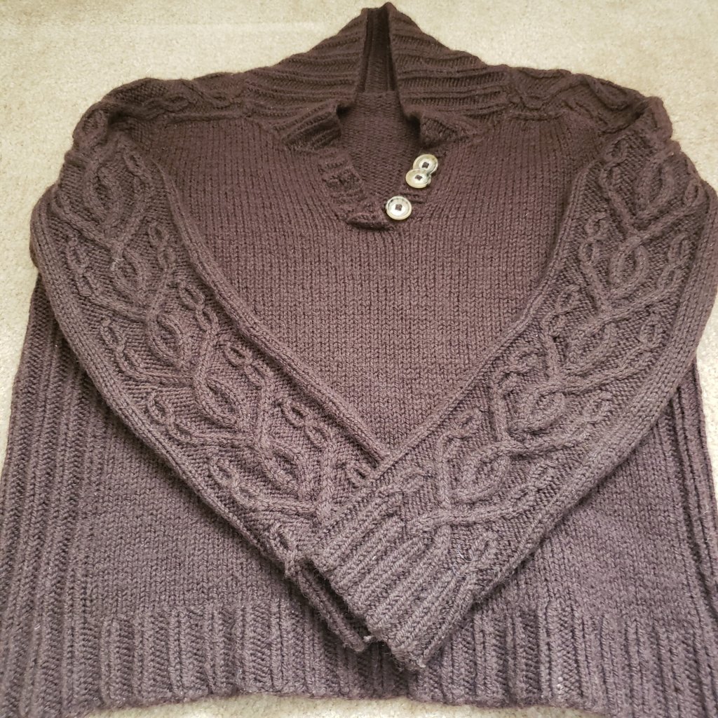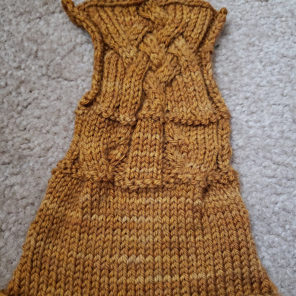 I introduce Husbando’s ‘2023 Sweater’ (ravelry link). The pattern is the ‘Sandy Neck Pullover’ by Moira Engel. The yarn for Husband’s sweaters is ‘Yowza’ purchased at the MDSW festival from Miss Babs. The colorway for this garment is ‘Old Gold’, and was acquired on the recommendation of a booth helper/worker. ‘Yowza’ is a Dk weight, 100% Superwash Merino yarn.