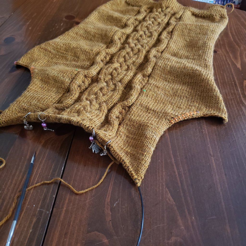 When a knitting palette cleanser is needed, “Husbando’s 2023 Sweater” (ravelry link) has been filling in wonderfully.
