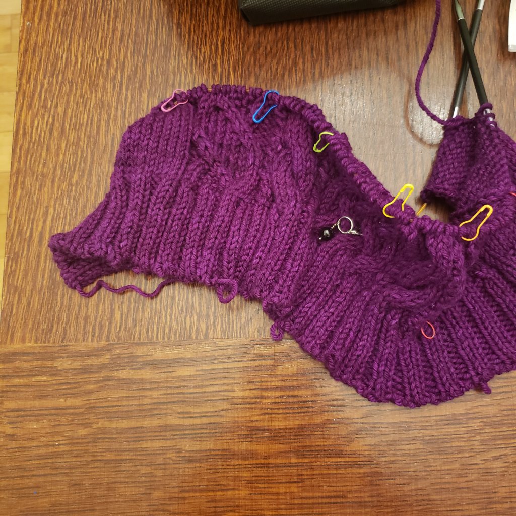 The front of the ‘DNA Pullover‘ (ravelry link) has been started. Pattern: “DNA Pullover” (Ravelry link) by Andrea Cull. Yarn: Neighborhood Fiber Co Organic Studio Worsted (ravelry link) in the coloway “Truxton Circle”.