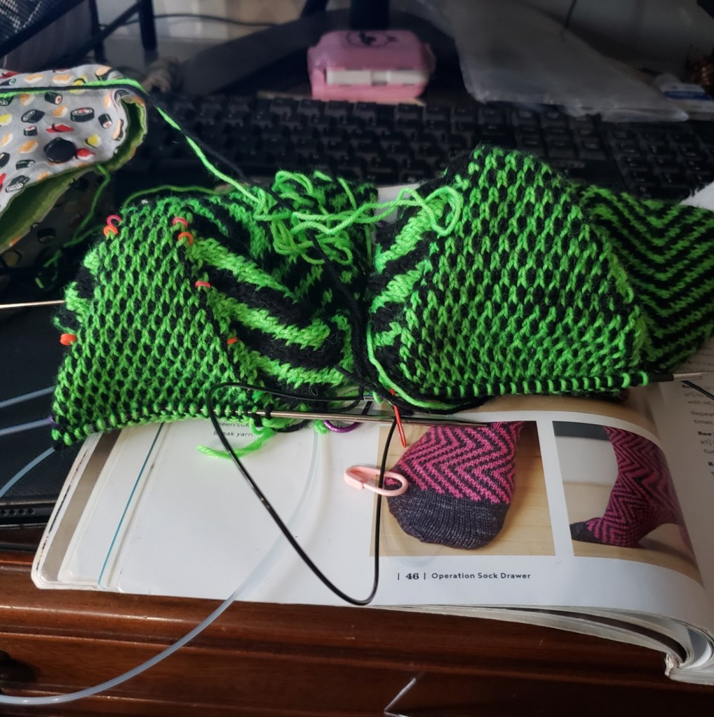 Counting and the eye-searing combination of yarn colors on the ‘Mesmerizing Riddler’ Socks conspired against me and I had to re-do the heel of one sock.