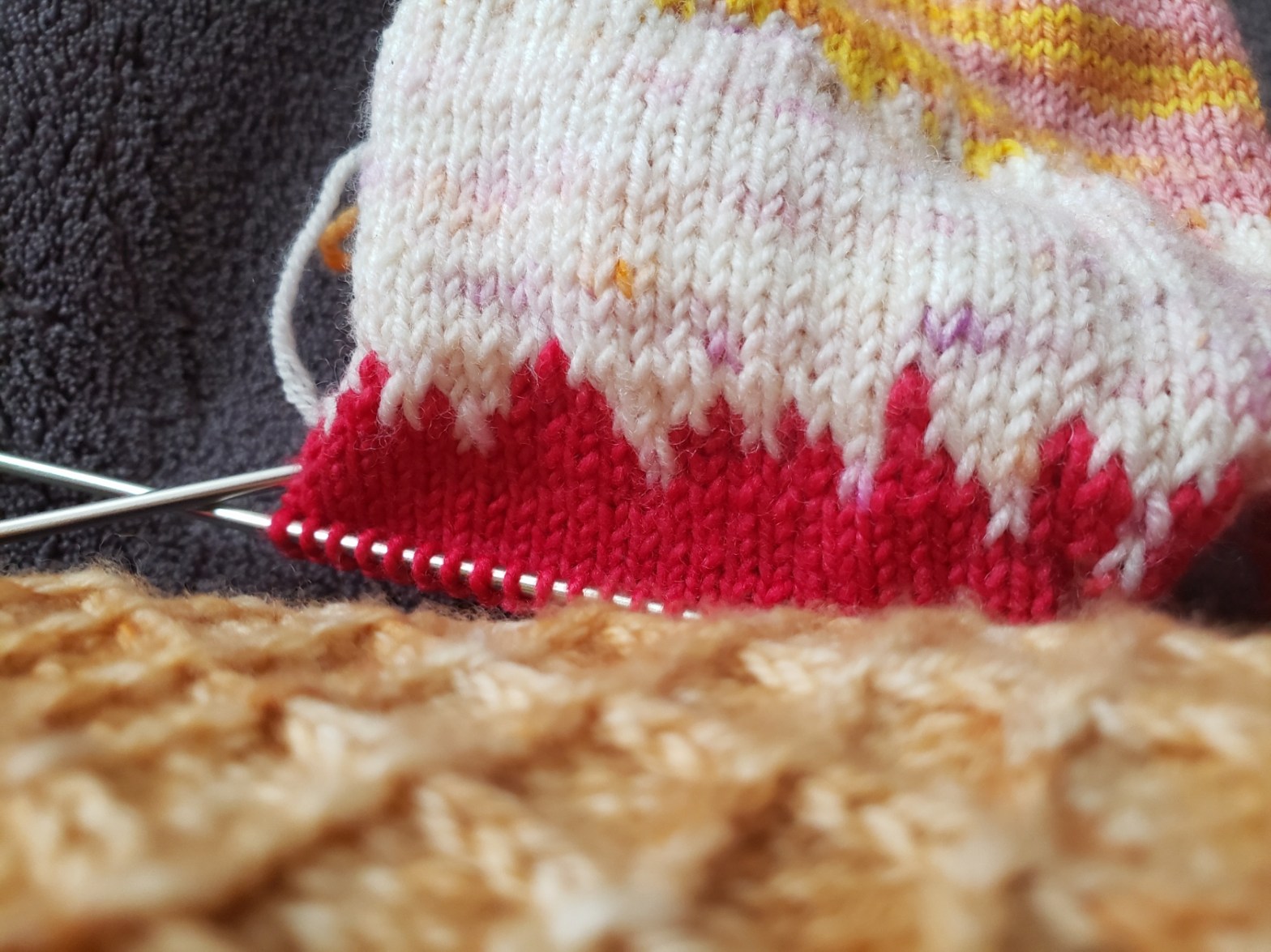 An update on Operation Sock Drawer (what!what!) with the “Kitties’N’Cream“(ravelry link) socks that I mistakenly called something else. I’m almost halfway through the ice cream scoops